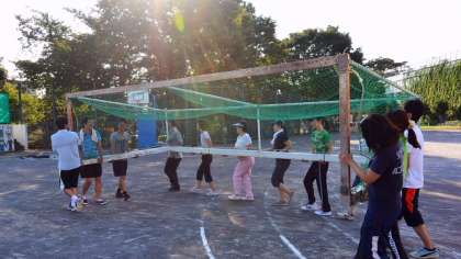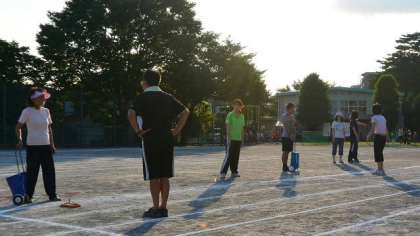 12日最後の話題は、放課後に日が傾きかけた中で行った職員作業のようすです。運動会に備えて、総出で校庭のライン引きなどの準備作業をしました。子どもたちもがんばっていますが、職員もがんばっています。