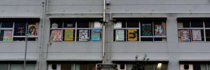 9月28日に開催する「40周年記念運動会」のスローガンを掲示しました。スローガンは「40年の歴史を胸にゴールまで」です。児童会が言葉を募集して決め、各学級が工夫して文字を装飾して、校舎4階の東校舎(音楽室校庭側)の窓に掲示しました。