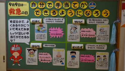 9月28日の運動会を目標に、子どもたちは練習に励んでいます。運動につきものなのがけが。練習には十分に気をつけて、準備運動や,練習途中の休憩、水分補給に心がけているところです。ところで、万が一けがをしたときの応急処置について、保健室前にわかりやすく掲示してあります。これは9月9日「救急の日」にちなんで、養護教諭が作成したものです。ご来校の際にご覧ください。