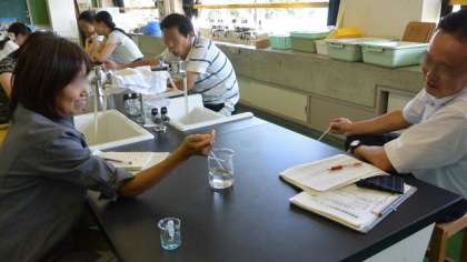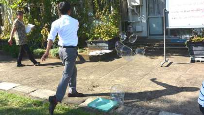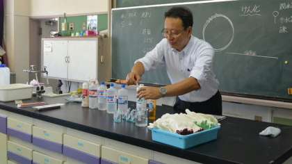 20日、研究授業の後、教員のミニ研修会をしました。子どもたちがこの日行った活動を、実際に教員がやってみたり、理科室で、シャボン玉がふくらむ原理と、よくふくらむシャボン駅の作り方について学んだり、実習では「水中シャボン玉」をつくったりしました。この後、ランチルームで、研究協議会を行い、この日の授業について意見を出し合いました。教員も理科に対する知識や技能を高め、授業に生かすための努力をしています。