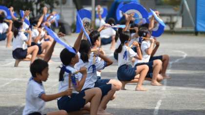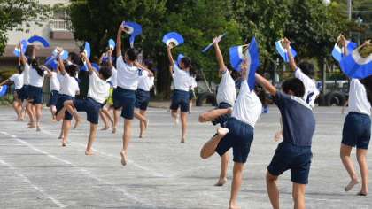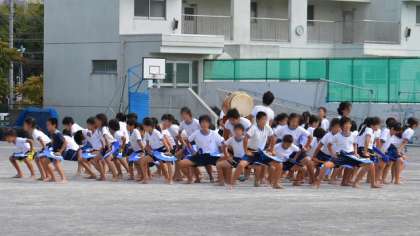 今日最後にお見せするのは、5・6年生表現種目「みかぐら」です。練習を積んできて、最終的な動きの調整段階です。今年初めて踊る5年生も、ずいぶん上手になりました。例年行っているみかぐらですが、今年の技の完成度は高そうです。校庭で裸足でがんばる5・6年生です。