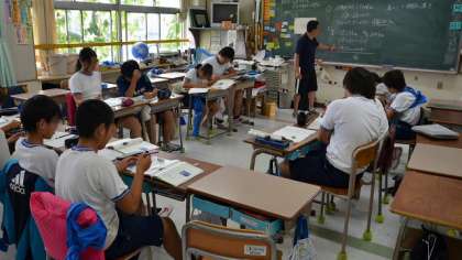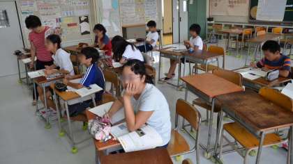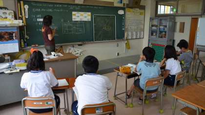 6年生の算数授業のようすです。今日は秒速、分速、時速の換算の学習です。6年生2クラスに指導者が4名、4グループで授業です。この学習は習熟が難しいところですが、少人数のきめ細かい指導で、理解を進めています。