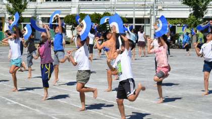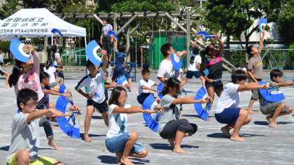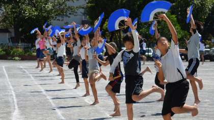 5・6年生の団体演技は、本校の伝統となっている「みかぐら」です。毎年6年生が、5年生に太鼓と踊りを教えて伝えています。今年は、5年生の踊りもレベルが高く、衣装にも凝ってみました。ご期待ください。