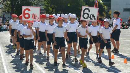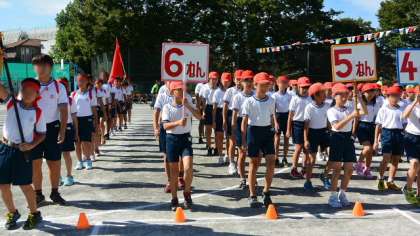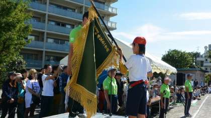 6年の入場行進は、さすが最高学年、ひときわりっぱです。全学年が入場し終わるまで、早く位置に付いた低学年も、音楽に合わせてしっかり足踏みして待ちます。入場行進が終わり、いよいよ開会式のセレモニーです。開会宣言の後、先頭で入場してきた校旗が返納されました。