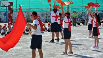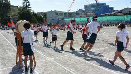 エール交換です。朝練習を積んできた応援団リーダーの晴れ舞台です。最初に赤組が応援。リーダーの意気込みに応えて、みんな大きな声で応援しました。