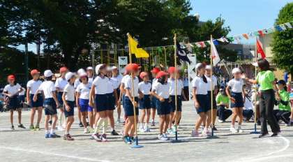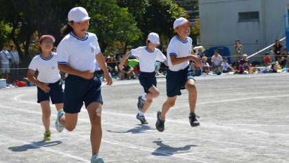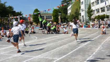 5年100m走。コーナーを立ち上がってからの直線は、全力で走ってくる子どもたちにとって体力がためされるところです。懸命に葉を食いしばってゴールを駆け抜ける姿に拍手です。