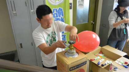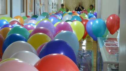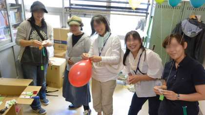 1年生ががんばって走っていた頃、東校舎一階では、応援の保護者の方にも手伝っていただき、風船飛ばしの準備が着々と進んでいました。廊下はカラフルな風船でいっぱいになりました。