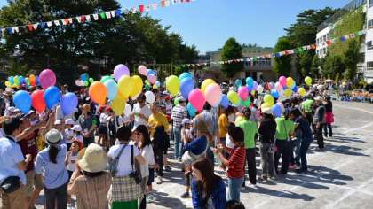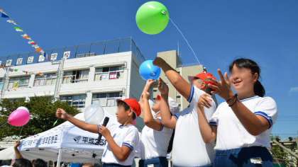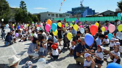 開校40周年を記念して、今年の特別プログラム「希望をのせて」(風船飛ばし)です。子どもたちの一言メッセージもつけて飛ばします。6年生の4人の代表児童の言葉の後、カウントダウンで一斉に手をはなしました。
