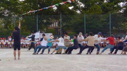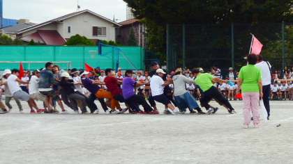 PTA・地域・卒業生・職員による競技、綱引きです。40周年を記念して「40年目の力くらべ」と名付けました。保護者や家族、卒業生、そして職員が加わって赤と白に分かれ、綱を引き合います。1回戦、互いに懸命に力いっぱい綱を引き合いますが、珍しいことに綱はびくともしません。結果は引き分けです。そして、陣を入れ替えて2回戦。40年目の力くらべは、わずかに引いた白の勝ちに終わりました。