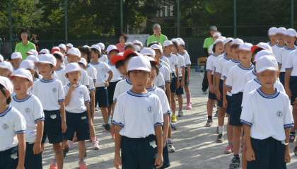 今日の運動会での思いを胸に、校歌を歌う子どもたちです。美しい歌声が校庭にひびきました。大きなけがやトラブルもなく、開校40周年記念運動会が、無事終了しました。参観いただき、子どもたちに大きな声援をおくっていただいた保護者・家族の皆様、地域の皆様に改めて感謝いたします。校長:千葉