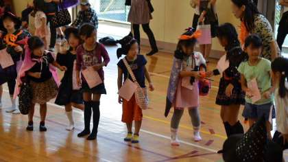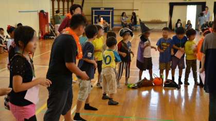◯✕クイズで盛り上がった後は、しっぽとりゲームで、みんな元気に体育館を走り回りました。続いて「カボチャゲーム」。みんな輪になって、カボチャのマスコットを音楽に合わせてとなりの人に手渡し、音楽のとまったところで持っていた人が負けです。どんどん抜けていって、最後は、なんとカボチャのマスコットを持っていた人が勝ち抜けというルールでした。勝った子どもたちには景品が出ました。