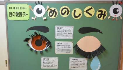 保健室の掲示版は、いつも工夫してあって、前を通る子どもたちが興味深そうに見ていることが多いのですが、今月のはいつもにも増してインパクト満点です。10月10日の「目の日」にちなんだ、目に関するミニ知識です。通りがかりの際、ぜひご覧ください。今日から養護教諭をめざして勉強している学生の教育実習が始まりました。しばらくの間、保健室には2人の先生がいます。よろしくお願いします。