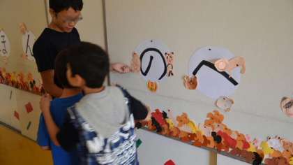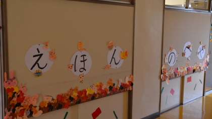 2階「絵本のへや」の廊下、掲示板のようすです。学校と所管事務の職員が下地となる装飾をしたところに、子どもたちの絵を切り抜いたものを貼り付けています。