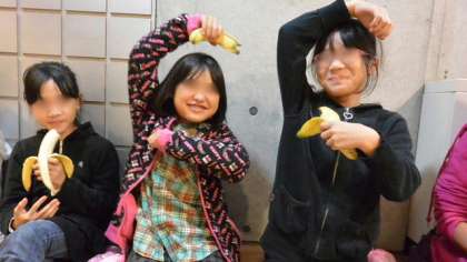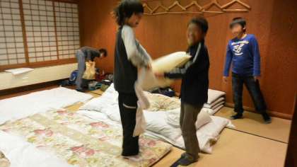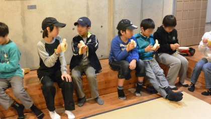 お楽しみの後は、大広間でおやつにバナナを食べました。キャンドルサービスとレクの余韻が残っている子どもたち。なんとなく絆が深まったような雰囲気です。おやつの後にも、寝るまでにやらなければいけないことがたくさん!布団も協力して敷き、シーツや枕カバーもしっかりつけました。