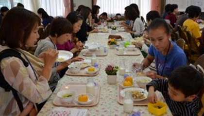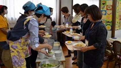 16日、台風一過の今日、ランチルームで、PTA家庭教育学級委員会主催の給食試食会が行われました。栄養士から学校給食について話した後、委員の皆さんが配膳係をしてくださり、給食の準備です。今日のメニューは、あんかけチャーハン、ブロッコリーのサラダ、みかん、牛乳。調理主事が毎日心をこめて、しかも衛生に最新の注意をはらって作っている給食です。いかがでしたか?お口に合いましたか? 家庭教育学級の皆さん、企画運営ありがとうございました。