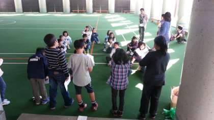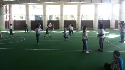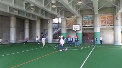登山の後、2時から室内レクをしました。疲れを知らない?子どもたち。しっぽとりとどろけいで、広い屋根つき広場をかけまわります。