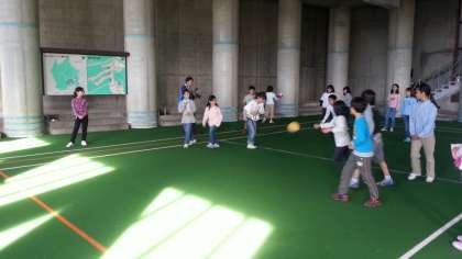 室内レクの最後は、ドッジボール。班の組み合わせを変えて、3回戦の熱戦を繰り広げました。1時間あまりの室内レクを、めいっぱい楽しんだ子どもたちです。終了後、おいしいリンゴジュースでのどを潤しました。