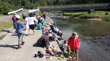 村めぐりの途中で、少しだけ川遊びをして楽しみました。田園プラザに11時40分に到着。