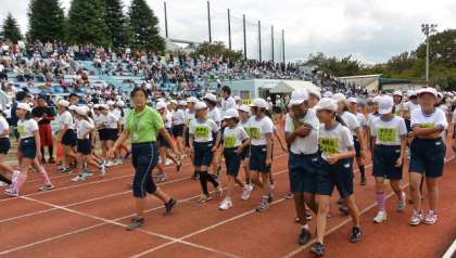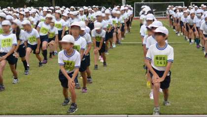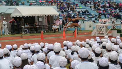 開会式後、みんなで準備体操をして体をほぐしました。競技の前に大学生の陸上競技トップアスリートによる模範を見せていただきました。見事なハードル走や走り幅跳び、三段跳びに子どもたちは歓声をあげていました。さあいよいよ競技です。はじめは全員でトラックを試走する「レッツランニング」です。みんなでわきあいあいと走りました。