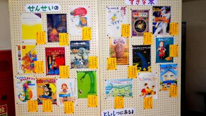 1階中央階段のところに、学校図書館担当の職員が掲示板を置いて、「先生おすすめの本」のコーナーをつくりました。本校の教員が、それぞれのおすすめの本を紹介しています。