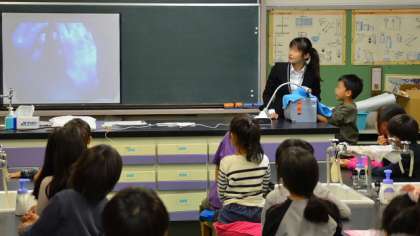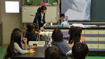 29日5校時理科室で、1年2組の子どもたちで、現在行っている養護教諭教育実習の研究授業を行いました。先日、1年1組で行った学習内容を、その時の反省をもとに、実習生と養護教諭が担任とも相談して練り直し、再度チャレンジしました。代表の子が、ブラックライトに当てると光るローションを手に塗って、手洗いの後どれくらい残っているかを確かめました。映像機器を使って、他の子どもたちにも見やすいように工夫しました。どうやったらうまく洗えるか子どもたちに聞くと、一生懸命考えて、様々な考えを発言していました。