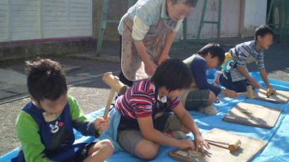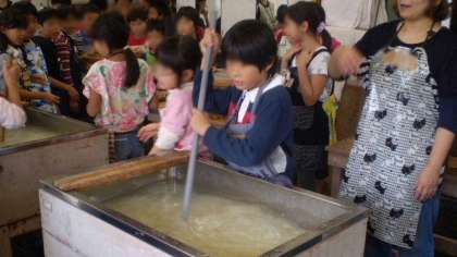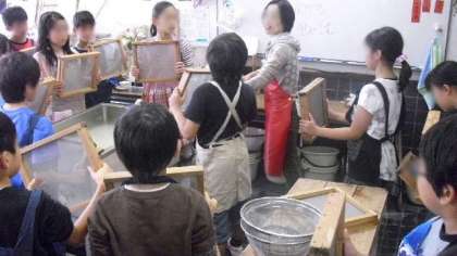 和紙の原料である「コウゾ」や「ミツマタ」の繊維をたたく音が響きます。次は細かくなった繊維を水槽に溶かし込み、とろみを流し込み、よく練ります。初めはなかなかうまくいかなかったのですが、慣れてくると良い手つきに変わってきます。何事も体験が大事ですね。さあいよいよ和紙の紙すきです。最初に木枠の使い方を習いました。