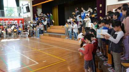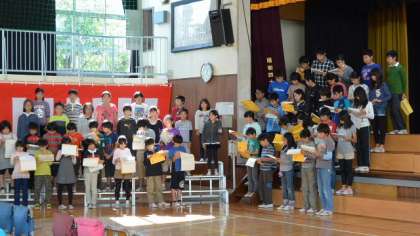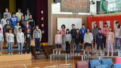周年式典練習の後半は、希望丘小学校の歴史を言葉と写真で綴る「呼びかけ」の練習です。一緒にあわせるのは今日が初めてで、台本を片手に持ちながらの練習になりましたが、みんな集中して取り組み、短時間でだいぶ息があってきました。学校教育において、日常的な学習はもちろん大切です。しかし今回の40周年式典などの大きな行事を通して、学校生活の節目に、希望丘小学校に在籍しているという意味を確かめ合い、自分の所属する集団をよりよいものにしていこうという目的意識を共有し、ともに励み努力していく姿勢をはぐくむことは、とても大切なことであると考えています。また、式典参列などの経験を通して、将来社会人として必要なマナーなどを学ぶよい機会です。先日服装等のことで、お願いの文書を出しましたが、がんばっている子どもたちにとって、大きな成果と達成感を得られる行事にするためにも、ぜひご協力をお願いします。