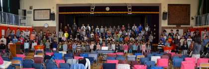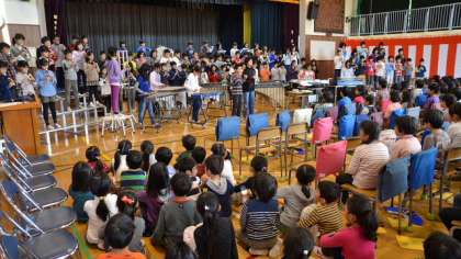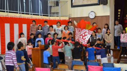 6日(水)、40周年記念式典にむけて、初の全校練習をしました。前半は4・5・6年生の合奏と歌、呼びかけです。一緒に参加した1・2・3年生が見守る中、高学年は力を発揮しました。群読「おまつり」の途中から1・2・3年生が加わります。お祝いの式典らしく、おみこしが華をそえます。最後は全校合唱です。今日も式典練習の話題でしたが、全校児童一丸となってがんばっています。8日の公開リハーサルには、多くの保護者の方々にお出でいただき、子どもたちを励ましていただければ幸いです。