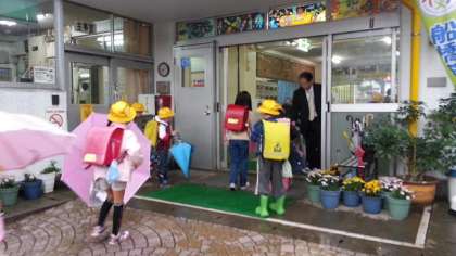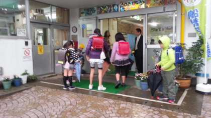 7日朝はあいにくの雨。子どもたちは雨がぱらつく中登校してきました。本校の構造上、玄関を通らないと各学年の昇降口に行けないので、雨に濡れた傘は、玄関入り口でしずくを振り落としてから入ることになっています。教員が指導のため入り口に立っていますが、どの子もきちんと自分からやっていました。おかげで、玄関の床はあまり、水にぬれることなくすみました。