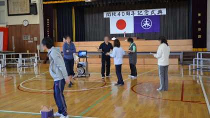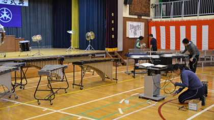 7日の放課後、教員総出で会場準備をしました。夕方からは祝賀会で使用する音響機器の準備に専門の方が訪れ、機材をセットしました。式典でもマイク関係はその機材を使わせてもらいます。