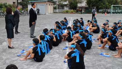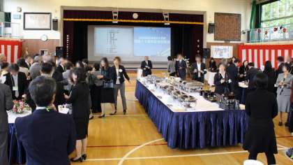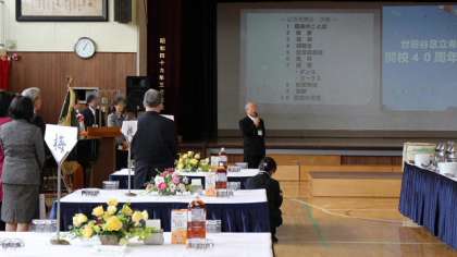 9日、記念式典終了後、56年児童が校庭で民舞「みかぐら」を披露。祝賀会を待つお客様に見ていただきました。13時、PTA周年委員会の皆さんとPTA会員の皆さんの手で、短時間ですっかり模様替えをした体育館で、40周年記念事業実行委員会主催の祝賀会が始まりました。たくさんのお客様に参加していただき、最初に実行委員長あいさつ、続いて来賓の皆様からお祝いのお言葉、鏡割りとプログラムは続きました。