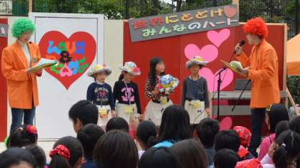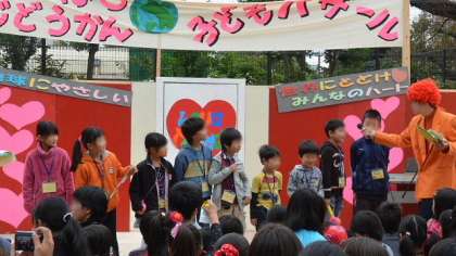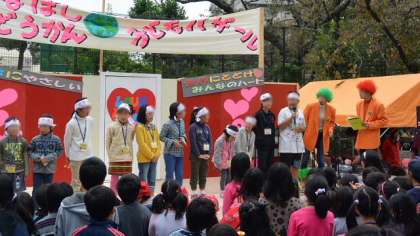 10日(日)、毎年恒例の船橋児童館の「子どもバザール」が行われました。心配されていた天気も、風は強いものの雨は降らず、10時の開会式をむかえることができました。ステージでは、この日出店した子どもたちのお店が次々と紹介されました。希望丘小学校の子どもたちも大活躍です。10時半、さあ楽しいお店のスタートです。