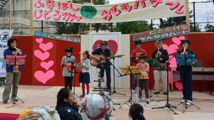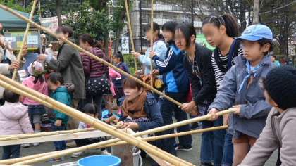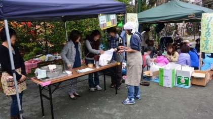 ステージでは様々なお楽しみ発表が繰り広げられています。また、地域の団体が運営する大人のお店も並んでいます。竹棒を子どもたちが持っているのは、この先にパン生地を巻いてたき火で焼く「遊びパン」のお店。おなじみの「希望丘小遊び場開放委員会」のお店です。PTAは食器の貸し出しのお店を、「ぶんか村」活動をしている青少年地区委員会は「リース作り」のお店を出しています。お世話になっている「小径の会」のお店も出ていました。会場は家族連れでどこも大賑わい。