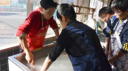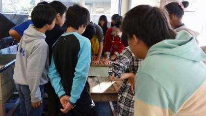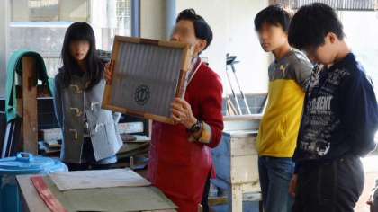 13日(水)、今日は6年2組が山崎小学校に併設されている伝統工芸室まで電車で出かけて、和紙の卒業証書を手すきしてきました。最初に紙すきの仕方について説明を受けて、世界でたった一つの自分の卒業証書づくりの開始です。