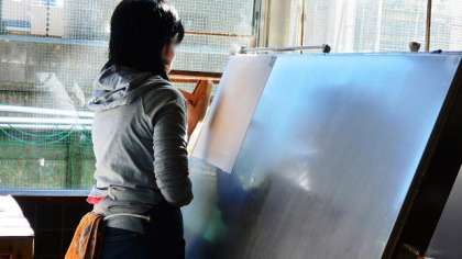 こうやって一人一人がすいた和紙は、工芸室の方がこの写真のように、1枚1枚ていねいに乾燥させて完成させます。出来上がった紙は、和紙専門の印刷屋さんに送られ、学校に戻ってきます。それにみんなの名前と卒業生番号を書き入れ、印をついて完成します。