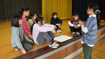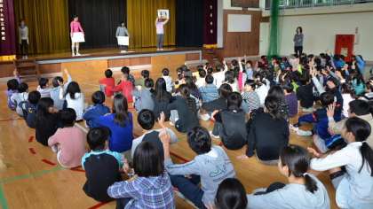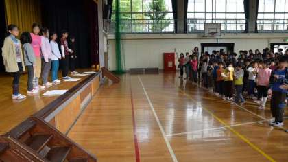 クイズの内容は、「1,具合が悪くなってきたらどうしたらよいでしょうか」「2,バイキンを体の外に出すにはどうしたらよいでしょうか」「3,かぜの予防はどうしたらよいでしょうか」の三問でした。皆さんわかりますか。みんな一生懸命考えて手をあげていました。発表が終わった後ステージ上でミニ反省会。保健委員会は全部で9人で活動しているのですが、この日はそのうち欠席が2名いたので、7人でがんばりました。すべてマイクを使わずに発表できたのもすばらしいですね。