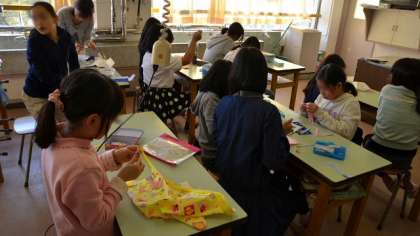 手芸・料理クラブです。各自が考えた手芸作品をつくりました。細かいところを手縫いする子、かぎ針編みに一生懸命な子、ミシンで大きめの布をぬっている子と様々ですが、どの子も一生懸命です。