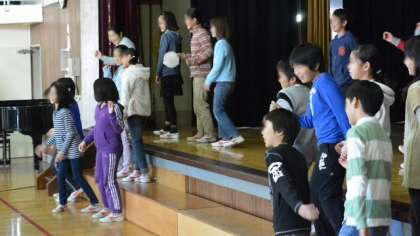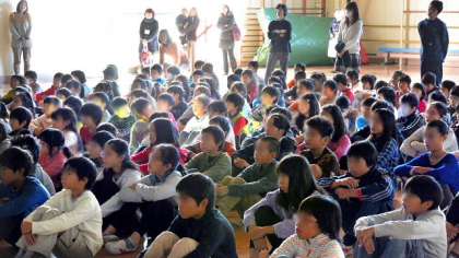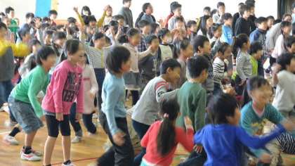 6年生は去年のことを思い出しながら、1〜4年生は、これから経験する移動教室への期待をもって聞くことができました。保護者の方もようすを見に来てくださいました。最後に移動教室で行ったゲームを、みんなで一緒にやってみました。みんなの笑顔あふれる、楽しい集会になりました。