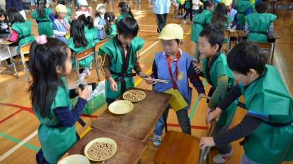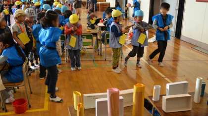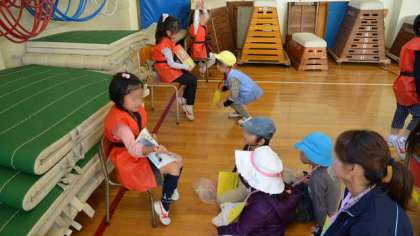 子どもたちは、運動会や40周年式典で使った、そろいのはっぴでお出迎えです。園児達はたくさんあるお店を、カードにスタンプを押してもらって回りました。