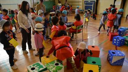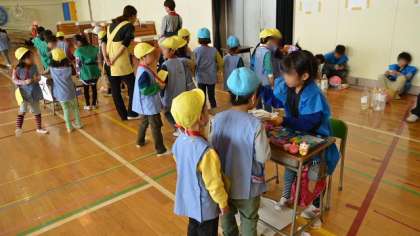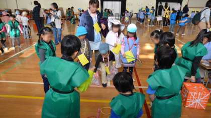 お店はもっとあります。「たからさがし」「レース」「わなげ」「クイズ」「しゃてき」「ボーリング」・・・まわって遊ぶ園児のみんなも楽しそうですが、お店をやっている1・2年生の子どもたちも、とても楽しそうで、夢中になってがんばっていました。
