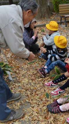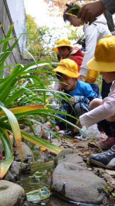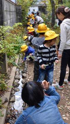 できあがった笹舟を、さっそく公園の近くの小径の水路で流してみました。みんなが作ったかわいい舟が、細い水路を次々と流れ、子どもたちは歓声をあげていました。自分で作ったオモチャで遊ぶ体験、今の時代だからこそ大事だと思います。