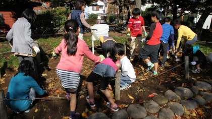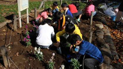 26日3校時、3年生が葭根公園で花壇の整備を行いました。葭根公園の一角の日当たりのよい場所を、ご厚意で使わせていただき、3年生が毎年担当して整備しています。今日も枯れた植物をとって、土を耕し、新しい花の苗を植えてきました。