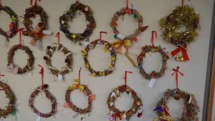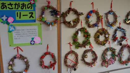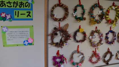 1年生が作ったリースが、教室の廊下に飾ってあります。これは、春から夏にかけて育てたアサガオのつるを使って作ったものです。それぞれが創意工夫して、きれいなリースができました。ご来校の際にご覧ください。