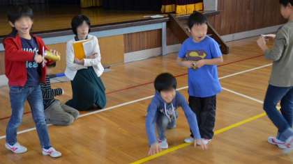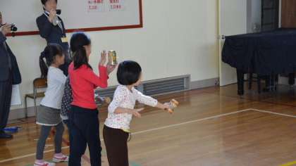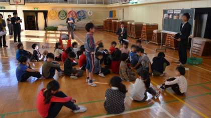 27日(水)午後、2年生の生活科研究授業を行いました。2年生は、この授業の前までに、ゴムの伸び縮みする性質を使ったオモチャを、身の回りの材料で工夫して作りました。今日は、そのオモチャで遊んでみようという授業です。体育館に自作のオモチャをもって集まった子どもたち。まず、この日の学習の目当てを確認して、それぞれ作ったオモチャの種類ごとのコーナーで遊びました。