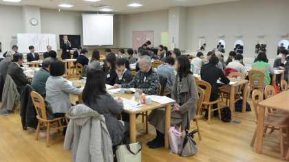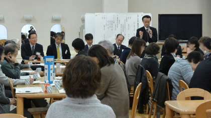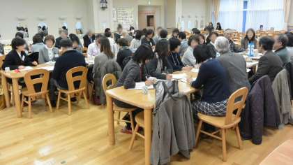 28日(木)、船橋小学校ランチルームで船橋希望学舎合同学校協議会を開催しました。合同学校協議会とは、船橋希望学舎に属する、船橋希望中学校、船橋小学校、千歳台小学校、希望丘小学校の4校に関わる機関や団体、保護者の代表の皆さんで構成されている学校協議会メンバーが一堂に会して、地域の児童生徒の教育にや生活に関わる話し合いを行う場です。協議会に先立って、区教育委員会幹部を交えた出前懇談会を行い、区の施策について説明を受けました。説明に対する質疑応答を終え、いよいよ協議に入ります。学校教育部会、健全育成部会、防犯・防災部会にわかれ、意見を交換しました。