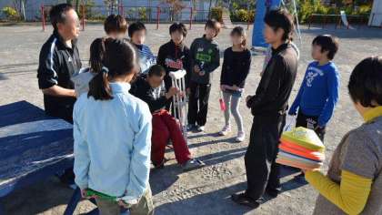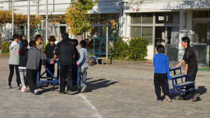 集会終了後、体育委員会児童が集まってミニ反省会。よく頑張った子どもたちに拍手です。最後にみんなで力を合わせて、朝礼台をもとの位置にもどしました。
