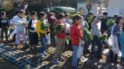 初めて大根抜きをする子もいて、ていねいに抜き方を教えてもらい、一人1本ずつ立派な大根をいただきました。青々とした葉っぱがついた大根です。葉っぱもおいしそうですね。子どもたちに、貴重な体験をさせていただきました。ありがとうございます。