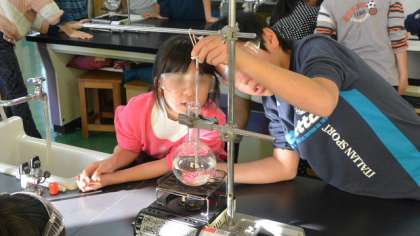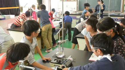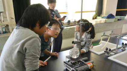 3日、4年生の理科実験のようすです。「温度と水のすがた」の学習をしているところで、今日は丸底フラスコに入れた水を、実験用ガスコンロで熱して、温度変化と水のようすを観察しました。どんどん水温が上がり、沸騰し始めるとみんなそのようすに夢中です。家庭で経験している現象かもしれませんが、改めて透明なガラス容器の中で変化のようすがよく見えるようにしてみると、子どもたちは興味津々です。フラスコの底から勢いよくブクブクと出る泡のようすに、びっくりしていました。