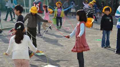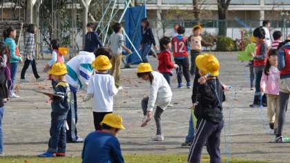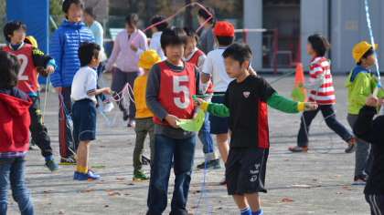 4日、中休みの校庭のようすです。子どもたちが校庭でなわとびをしています。低学年は赤いゼッケンをつけた「なわとび検定員」(体育委員)に技の認定をしてもらっています。これからの時期、狭いところでも継続してできるなわとびは、体力作りにもってこいですね。