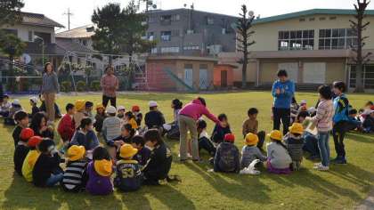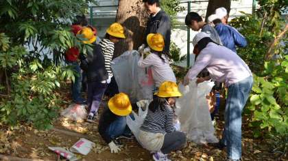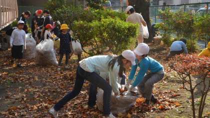 30分ほどの作業でしたが、子どもたちがよく頑張り、それぞれ分担した場所の落ち葉がずいぶん片付きました。校庭に戻ってきた子どもたちは、芝生の上で輪になって、班長を中心に今日の反省をして「地域美化タイム」を終了しました。